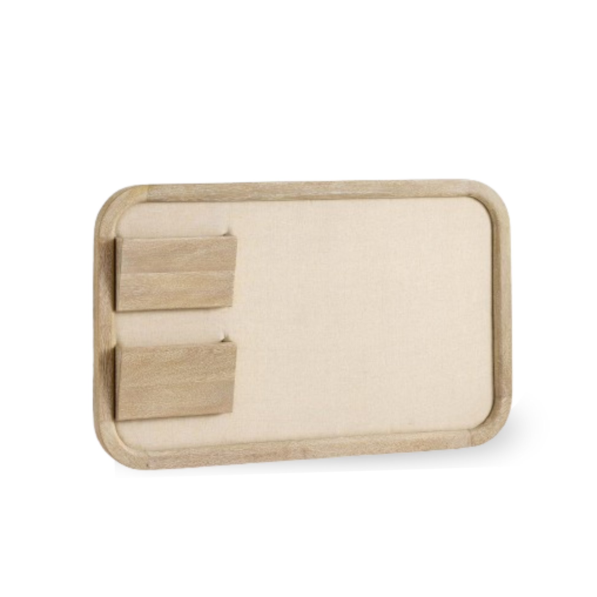 - Linen-covered pinboard with mango wood frame.