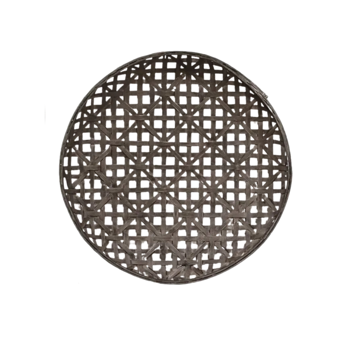 The baskets is a set of three nesting baskets. They are stained dark brown with a tight, tobacco-style woven texture that can be dressed up or down in the country home with florals or other accessories. The largest basket measures 17 ½” in diameter by 2 ¾” deep.