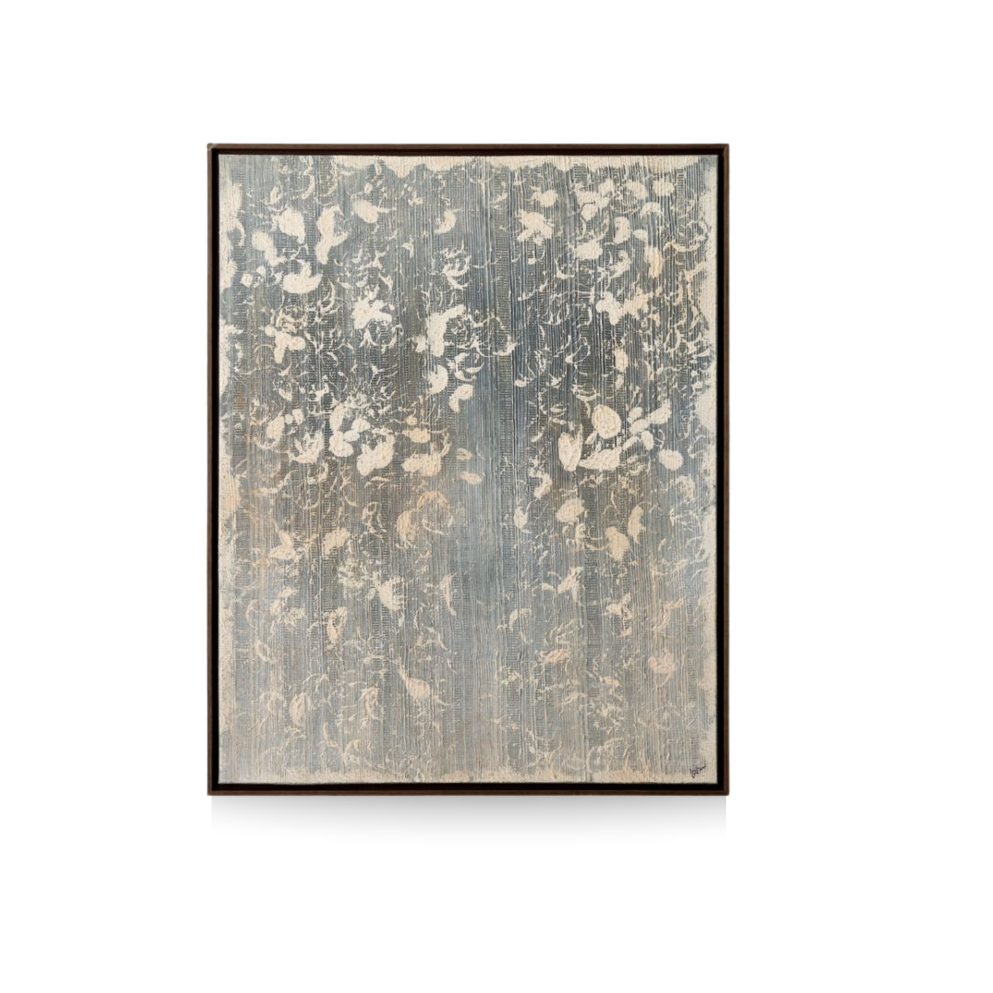 In "Lucidity," Edward View references the green marble he sees utilized in architecture, layering dabs of paint over a fabric-like background to replicate the marble's veining and weathered texture. CB2 exclusive.