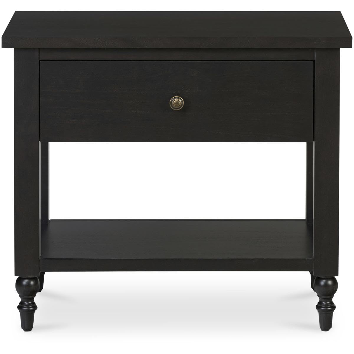 Details: The Katherine nightstand features generous dimensions that offer ample drawer and open storage. Crafted from high-quality Acacia wood and complemented with Acacia Veneer, this piece promises lasting beauty with a statement of refined taste punctuated by the timeless elegance of the classic brass handle. Features: - MDF with Acacia veneer on top, sides, shelf panel, drawer front & Acacia drawer sides, leg, frame - Matt black finish with a finished back - Brass handle - Soft closing metal side mounted glides - Some assembly required